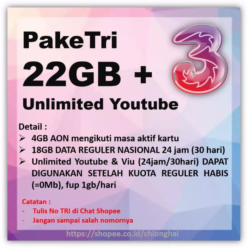 Kartu Perdana Tri Special 22gb Unlimited Youtube Lokal Medan Shopee Indonesia from cf.shopee.co.id Begini caranya agar bisa mendapatkan paket tersebut. Paket internet tri unlimited adalah paket sepuasnya yang diberikan oleh provider tri untuk para penggunanya tanpa ada batasan kuota dengan di dalam paket internet tri unlimited para pengguna bisa membeli tri unlimited 1 jam, tri unlimited 3 jam, tri unlimited 12 jam, dan tri unlimited 24. Dengan paket tri unlimited pelanggan dapat menikmati akses internet sampai akhir masa berlangganan program ini berakhir, dengan ketentuan batas pemakaian wajar (fair use policy) 5 gb. Paket murah 3 24 jam. Paketnya terbagi atas alwayson, internet unlimited dan juga unlimited alwayson yang dapat dibeli oleh pelanggan prabayar 3 sesuai ketentuan berlaku. Paket unlimited ini berlaku 24 jam penuh setiap harinya, tanpa ada ketentuan alokasi waktu. Paket ini termasuk paket baru karena mulai berlaku pada 21 september 2020. Paket internet tri unlimited 3 jam ini memberikan kebebasan penuh kepada pengguna untuk melakukan aktivitas berbasis internet selama 3 jam.